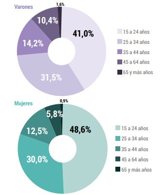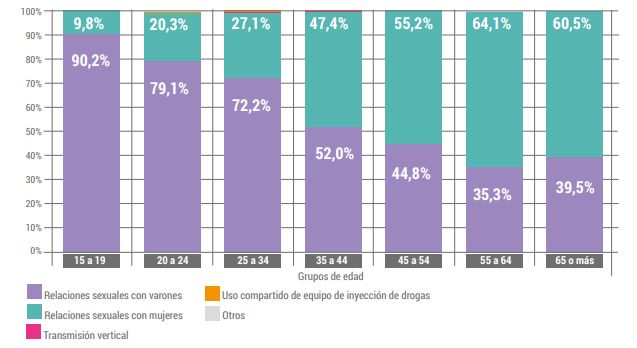 Transmisión del VIH Más del 98% de las personas diagnosticadas con VIH en el bienio 2019-2020 lo adquirieron por vía sexual. En el caso de los varones, el 36% en relaciones sexuales con mujeres y el 63% con otros varones. El VIH en los adolecentes La población de entre 15 y 19 años se infectó con VIH, en su mayoría, por vía de transmisión sexual y la tasa de infección fue mayor en los varones. A su vez, más del 90% de ellos se contagió a través de relaciones sexuales con otros varones. Distribución de las vías de transmisión del VIH en varones según grupo etario. Bienio 2019-2020.